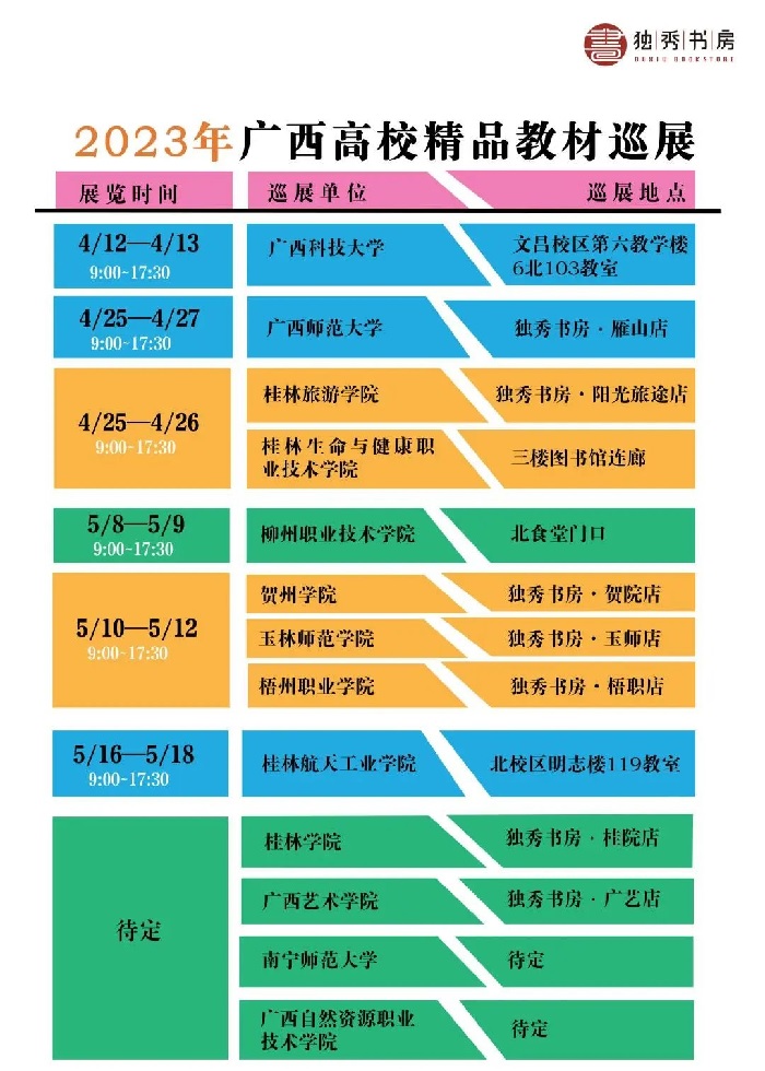 在党的二十大精神和习近平新时代中国特色社会主义思想指引下,在教育部和国家新闻出版署指导、大学版协的领导下,按照大学版协代办站工作委员会年度工作安排,广西师范大学出版社高校图书代办站(广西师范大学出版社集团广西独秀书房图书有限公司)定于2023年4月至5月在广西地区举办“2023年广西高校精品教材巡展”。
