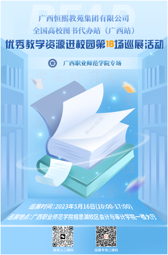 2023年5月16日,2023全国高校教材巡展“优秀教学资源进校园”(广西高校图书代办站)第16场活动在广西职业师范学院举办。