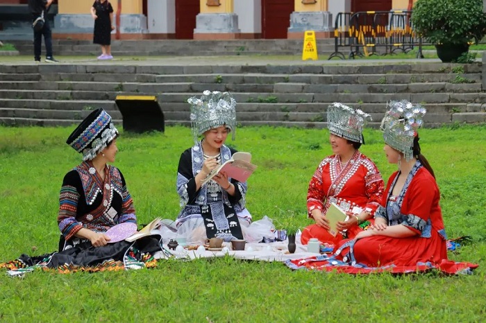 广西师范大学国家语言文字推广基地的成员们头戴银饰,身着广西特色民族服装,在靖江王府用多元化的方式共读经典,寄情于山水,营造了独具广西民族特色的浓厚读书氛围。
