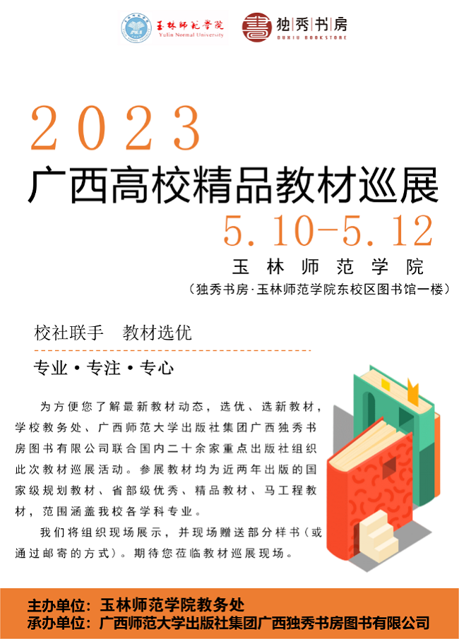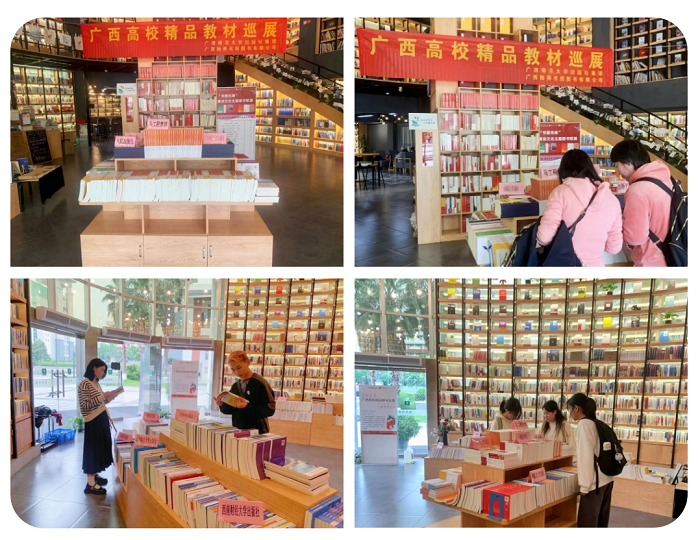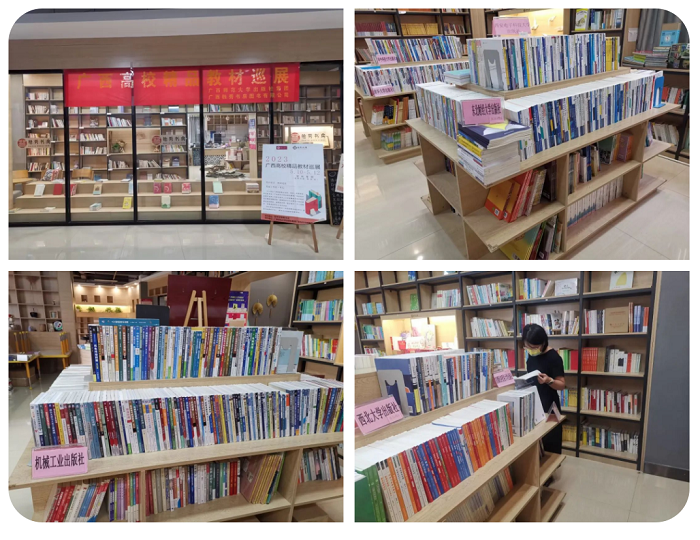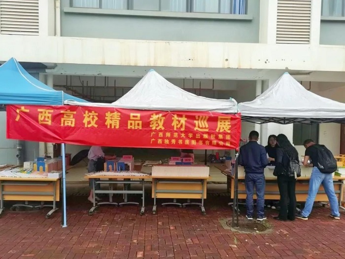 2023年4月12日至6月15日,由广西师范大学出版社集团广西独秀书房图书有限公司(以下简称“独秀书房公司”)联合国内30余家知名出版机构在广西区内13所高校开展了为期63天的“2023年广西高校精品教材巡展”,参展教师逾千人,参展教材均为近两年出版的国家级规划教材,省部级优秀、精品教材、马工程教材,范围涵盖学校的重点学科专业,为高校的教材征订工作提供了直观、简单的运作模式。