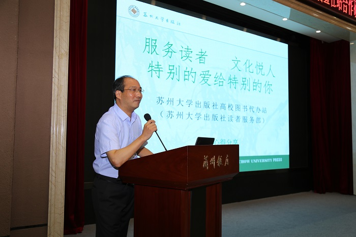 苏州大学出版社副社长、代办站站长朱绍昌以《服务读者 文化悦人 特别的爱给特别的你》为主题做了发言,他谈到苏州大学出版社高校图书代办站始终秉承“守正创新 服务第一”的原则开展教材供应工作,并从四个维度进行了详细介绍:一是适应时代发展需求,丰富教材服务内涵;二是强化内部制度建设,提高整体竞争实力;三是整合上游优质资源,搭好社校交流平台;四是正确处理几个关系,促进行业融合发展。