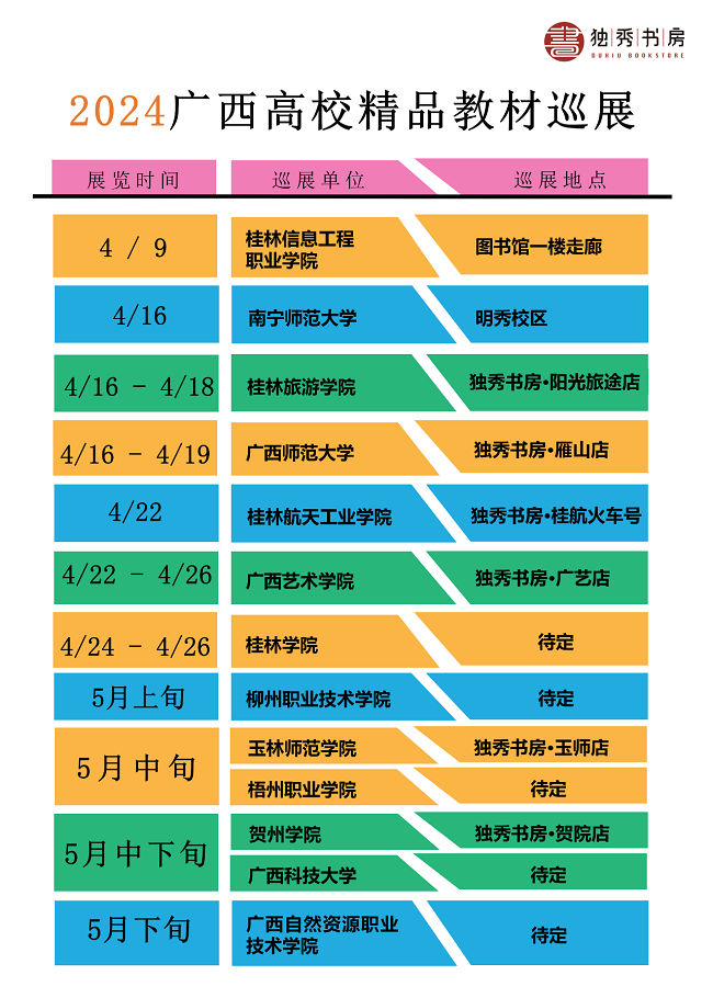 在党的二十大精神指引下,按照大学版协代办站工作委员会年度工作安排,广西师范大学出版社集团广西独秀书房图书有限公司定于2024年4月至5月在广西地区举办“2024年广西高校精品教材巡展”。