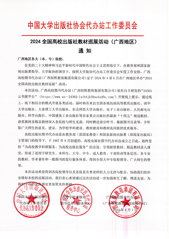 为更好地将出版社优质的教学资源无缝对接到学校,打通出版社和学校的沟通壁垒,将各出版社的优秀产品和优质资源最大程度进行宣传展示,更好地服务于各出版社的教材营销和选题出版等工作,在大学版协的领导下,按照大学版协代办站工作委员会年度工作安排,广西高校图书代办站(广西恒熙教苑集团有限公司)计划与2024年4-6月在广西区策划组织“2024全国高校出版社教材巡展”活动。线上巡展的同时,在条件允许的情况下,为满足不同的需求将举办线上线下同步巡展活动。
