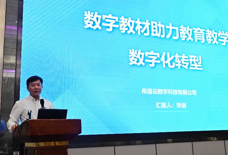 舟道云数字科技(贵阳)有限公司总经理李剑展示了数字教材平台的具体功能,如融入多种内容、实现互动交流、支持虚拟仿真等,并介绍了公司的产品体系,为数字教材的发展提供了新的思路与解决方案。