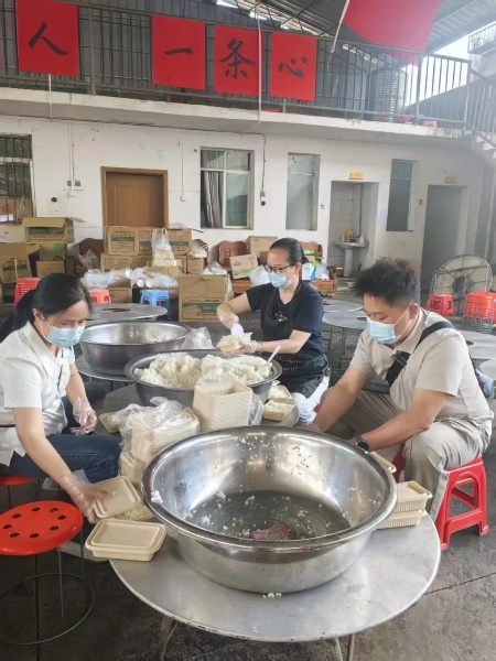 在救灾现场,贵州高校图书代办站了解到前线抢险人员后勤保障压力较大,便主动加入当地后勤队伍,与居民们一起动手,为救援人员赶制、分装盒饭,保障抢险人员吃上热餐。