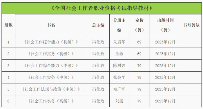 6.图书概况。全国社会工作者职业资格考试由中央社会工作部与人力资源社会保障部联合组织。《全国社会工作者职业资格考试指导教材》是人大出版社承担的重要项目和出版的系列重点图书,是参考者和培训辅导机构的在市场上无可替代的重要指导教材。出版情况如下: