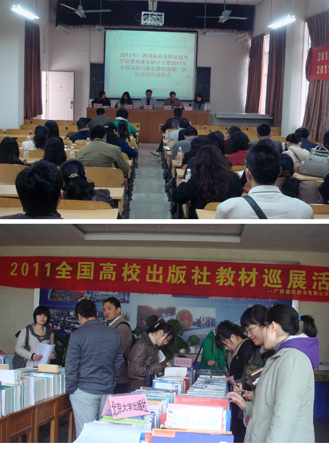 3月23日广西地区“2011全国高校出版社教材巡展”活动在广西国际商务职业技术学院正式启动。此次大型精品教材联合巡展活动是广西教苑图书有限公司自2008年组织承办高校出版社教材巡展活动以来的第四届,活动旨在通过精品样书进校园搭建一个平台,服务好出版社、服务好高校。本届活动共组织邀请了包括高等教育出版社、清华大学出版社、北京大学出版社、电子工业出版社、人民邮电出版社、中国人民大学出版社等在内的30多家全国优秀出版社参展,共展出包括计算机、机电、财经等专业类别的6000多种精品优秀教材。