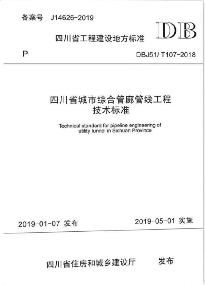 关于发布工程建设地方标准 《四川省城市综合管廊管线工程技术标准》的通知 川建标发〔2019〕19号 各市州及扩权试点县住房城乡建设行政主管部门,各有关单位: 由中建地下空间有限公司和成都市市政工程设计研究院主编的《四川省城市综合管廊管线工程技术标准》已经我厅组织专家审查通过,现批准为四川省推荐性工程建设地方标准,编号为DBJ51/T 107-2018,自2019年5月1日起在全省实施。 该标准由四川省住房和城乡建设厅负责管理,中建地下空间有限公司负责技术内容解释。