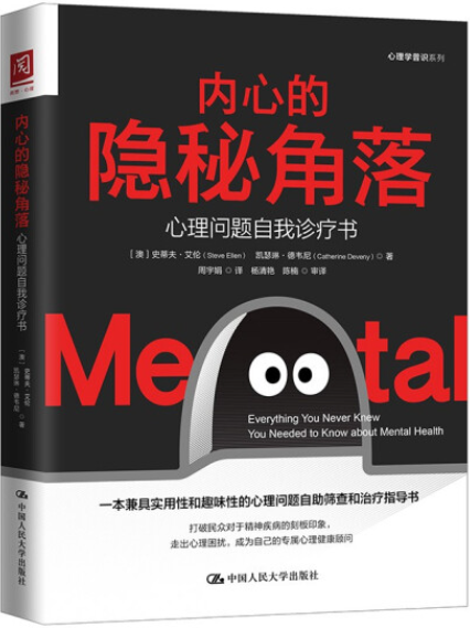 这正是来自澳大利亚的精神科医生史蒂夫?艾伦和作家凯瑟琳?德韦尼在《内心的隐秘角落》这本书里,向我们介绍和讨论的问题。这是一本兼具实用性和趣味性的精神障碍自助科普指南,用浅显易懂的语言向我们介绍了精神障碍的分类标准、可能诱因、常用的治疗方法以及一般的就诊流程,从相关症状、疾病种类、自我筛查评估、治疗等方面对抑郁障碍、焦虑障碍、人格障碍、精神分裂症、成瘾等常见精神障碍进行科普性的阐述。专业经验和优美文笔的结合使这本书不仅具有良好的理论基础,也具有实际的应用价值。除此之外,这两位作者还以自己的患病经历和亲身体验为例,勇敢地和我们分享了他们在面对精神疾病时的痛苦、挣扎和努力。正如史蒂夫?艾伦医生所说:“掩盖问题的同时,我们就在放任这个问题继续滋长;努力隐藏秘密的同时,我们就在增加其他人获取帮助的难度。我们需要改变。”