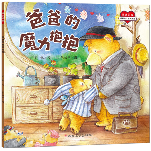 “满满的爱”安全感系列绘本共有8个分册,分别是:《妈妈的魔法亲亲》《爸爸的魔力抱抱》《妈妈上班时会想我吗》《爸爸上班时会想我吗》《我好喜欢妈妈》《我好喜欢爸爸》《一会儿是多久》《爸爸不见了》。这是一套帮助孩子建立安全感的绘本,选择了8个在生活中很有代表性的主题,旨在帮助孩子缓解由于分离而引起的较大的离别情绪反应——分离焦虑,引导孩子学会正确、良好地控制自我情绪,建立充足的安全感。在亲子共读时,爸爸、妈妈和孩子可以一起学习、一起成长,一起感受到满满的爱!儿童心理专家和知名童书作家倾情推荐。 《爸爸的魔力抱抱》:小灰熊艾米喜欢和爸爸抱抱,他觉得爸爸的抱抱有让他充满精神的魔力。这天,爸爸出差了,没有了爸爸抱抱的艾米觉得做什么都提不起精气神。正当他郁闷的时候,却收到了来自爸爸的神秘礼物,这个神秘礼物是什么?它会让艾米开心起来吗?