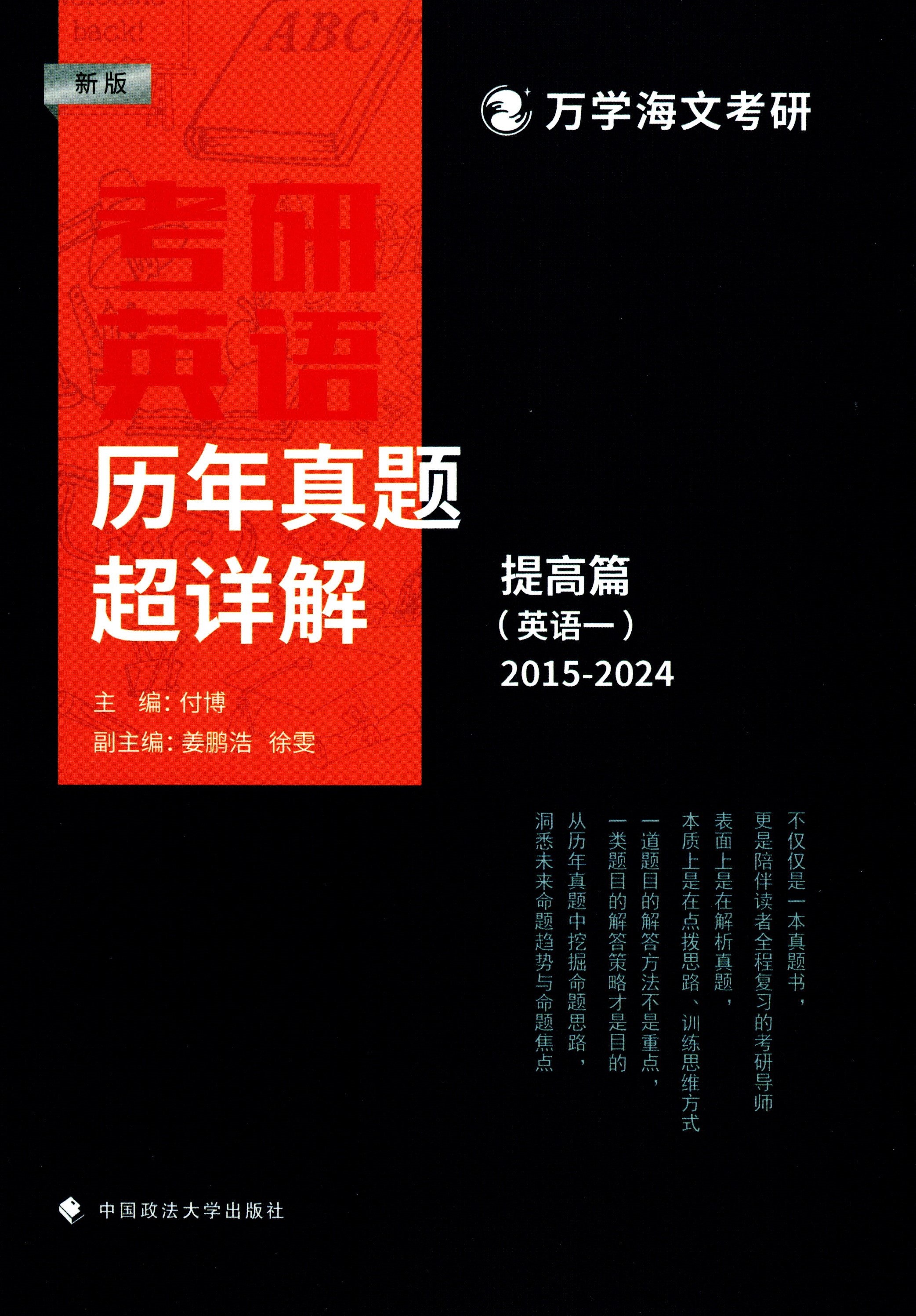 此系列分为英语一和英语二(适用于MBA、MPA、MPAcc等专业学位硕士研究生)两本书,此系列是《考研英语历年真题超详解(基础篇)》的提高版,适用于有一定英语基础或英语基础还不错的学生,英语一/英语二分别包含2015-2024年十年真题。 本书的主要特点就是命题规律和解题思路的权威指导和深度分析,“授人以鱼不如授人以渔”,本书的解析在编写思路上给出了最关键的“how”和“why”,即“怎么选(怎么写)”和“为什么选(为什么写)”:完型填空解析注重文章句际关系推理和词义辨析两个方面;阅读理解解析注重正确选项的选取和干扰项排除在原文中的证据支持;阅读新题型解析重点关注段落大意归纳和段落排序的关联证据特点;翻译部分解析重点关注句型结构解析和英汉语序差异调整;写作部分注重应用文和图画作文句式的学习、仿写和应用。而这些恰好是考生多年来在英语学习方面共有的不足。