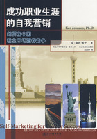 序一/Dr.Michael T.C.Hwang 序二/叶光煌 前言 绪言 第一部分 成功职业生涯自我营销 第一章 一种新的思维方式 关于工作和职业生涯的旧思想 就业竞争危机 新问题需要新思想 新思想,新选择 职业生涯的新思想 利用自我营销的方法管理你的职业生涯 第二章 自我营销 孙子兵法 你的职业生涯,你的生意 把营销理论应用到你的职业生涯中 自我营销的5Ps 未来的财富 创新 品牌 竞争优势 职业生涯履历:个人营销计划 第三章 产品 你是谁? 自我评估:发现你的产品价值 雇主要的是什么:整体素质 整体素质:多元智力理论 多元智力和职业生涯选择 雇主想要的能力 人际交往能力 恿考能力 完成任务能力 专业技能 雇主想要的经验 校园经历 兼职工作 志愿者经历 实习和社会实践 个人成就和失败经历 雇主想要的教育背景 雇主想要的性格 积极的态度 自信 诚实和道德的 负责任的 忠诚的 能在压力下工作 愿意学习 灵活性 雇主认可的兴趣 你要考虑的价值 第四章 定位 定位 在就业市场上给自己定位 创建一个个人品牌:敢于与众不同! 如何创建个人品牌? 自我介绍:如何传达你的品牌信息 找到你的职业生涯方向 个人使命陈述:找出你的激情和目标 如何写个人使命陈述 确定你的目标市场 …… 第五章 价格 第六章 促销 第七章 渠道 第八章 终身职业生涯管理 总结 终身职业生涯成功的自我营销 第二部分 职业生涯履历自我分析手册