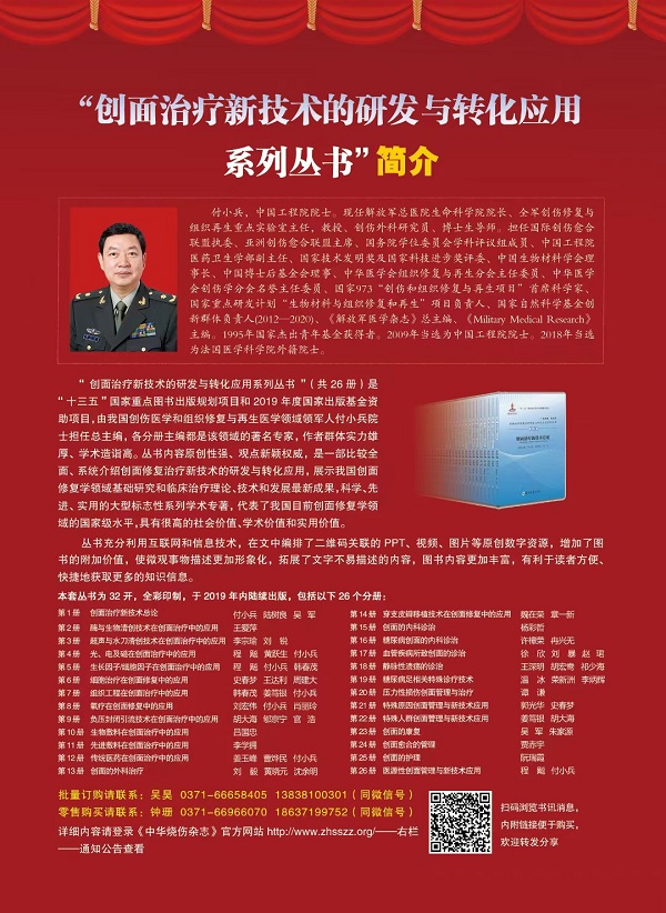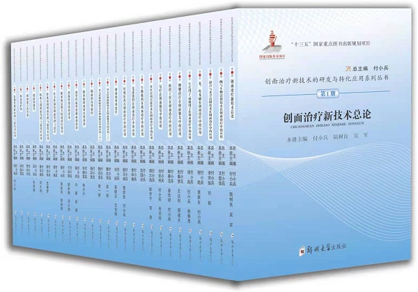 由郑州大学出版社承担的国家出版基金项目“创面治疗新技术的研发与转化应用系列丛书”,规模宏大,体系完整,逻辑严密,创新性强。共26册、667.5万字、6464幅图片。丛书由中国工程院院士、美国工程院院士、中国创伤医学和组织修复与再生医学首席科学家付小兵担任总主编,各分册主编均为创伤医学领域具有重要影响力的著名专家,并联合国内500余位具有扎实理论功底和丰富创面治疗经验的专家和中青年技术骨干共同精心编撰而成。是一套全面展示我国创面治疗领域基础研究、临床治疗理论和技术发展的最新成果,具有较强的学术性和实用性,对推动我国创面治疗技术的科研、教学及临床应用具有重要的理论和实践价值。