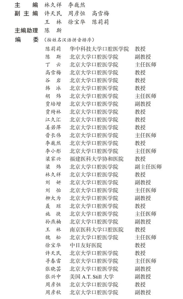 李巍然 主任医师、教授、博士生导师。北京大学口腔医学院正畸科主任,中华口腔医学会正畸专业委员会副主任委员、中国医药教育协会口腔委员会副主任委员、中华口腔医学会唇腭裂专委会常委、中国医学促进与对外交流会睡眠专委会常委、中国睡眠研究会儿童睡眠分会常委、北京口腔医学会常务理事、北京口腔医学会正畸专委会副主任委员、美学专委会常委、国际牙医师学院院士、英国爱丁堡皇家外科学院口腔正畸专科院员及考试委员会委员、《中华口腔正畸学杂志》副主编、Orthodontics Craniofacial Research副主编及American Journal of Orthodontics & Dentofacial Orthopedics,Angle Orthodontist, European Journal of Orthodontics 等多个国外杂志审稿专家。在国内核心期刊及国际SCI杂志发表第一及通讯作者论文110余篇,主编及参与编写口腔正畸学教材及专著20部。