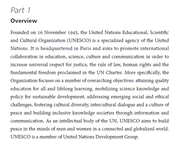 联合国教科文组织旨在推动各国在教育、科学和文化领域开展国际合作,以此在全世界范围保障《联合国宪章》中所强调的公平,法制,人权与自由。组织致力于推广全面、终身的高质量教育;以可持续发展为核心目标,推动科学发展与政策制定;解决频发的社会及道德问题;维护多元文化、促进跨文化交流,以期通过信息共享与沟通打造和平友好、兼容并包的理想社会。