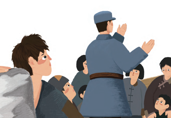 至于绘本封面,绘者更是另辟蹊径,摒弃了一贯的红色调,而采用了大面积的绿色,寓意中国面向未来所焕发的生机和活力,同时更代表希望——身处旧中国时人民心中所存的希望,以及新中国后人民所感受到的对于美好未来的希望。此外,在绿色的封面上还有一朵白色蒲公英,以及一只瓢虫,它们与内文遥相呼应,传达出中国人民坚强勇敢、自信乐观的象征意义。