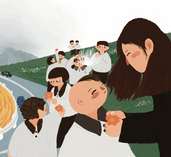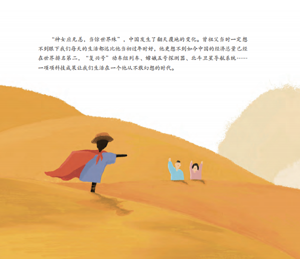 绘本中既有苦难的岁月,也有活泼的现代生活。绘者整体采用了柔美的色彩、独特的画风,从而照顾到文中起伏较大的情绪,平衡了不同的感受。同时,为了体现新中国所取得的伟大成就,绘本在局部采用了连跨三页的大拉页构图,让孩子们体验到强大的艺术冲击。