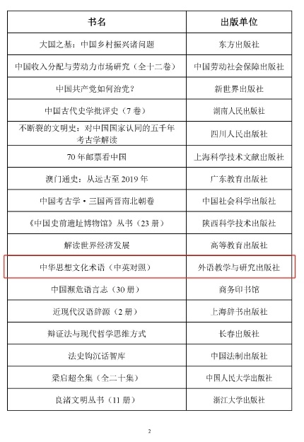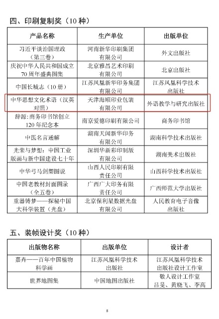 近日,国家新闻出版署发布《第五届中国出版政府奖入选获奖名单公示》,由外语教学与研究出版社出版的《中华思想文化术语(中英对照)》一书荣获第五届中国出版政府奖图书奖提名奖和印刷复制奖。