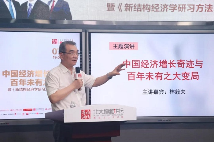 林毅夫应邀作“中国经济增长奇迹与百年未有之大变局”主题演讲,并与新书的两位合作者王勇、赵秋运共同带来新书内容的讨论和分享。本次活动由北京大学校友会、北京大学新结构经济学研究院、北京大学出版社、长安街读书会共同主办,北大博雅讲坛、北大学堂、北京大学创业训练营、北京大学融媒体中心承办,由多家媒体平台同步直播。活动由北京大学校友工作办公室主任,校友会副会长兼秘书长李文胜主持。