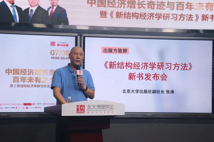 北京大学出版社副社长张涛代表出版方致辞。张涛表示,新结构经济学是林毅夫先生过去20多年来所致力于研究和推广的重要理论,是从中国和其他发展中国家的经济发展与转型实践出发,所进行的自主理论创新。北大出版社希望能和林毅夫及其团队一道,更好地普及新结构经济学理论,传播中国经验,讲好中国故事,为助力中国的经济发展,实现中华民族的伟大复兴,乃至帮助世界上所有发展中国家的共享和繁荣,做出独特的贡献。