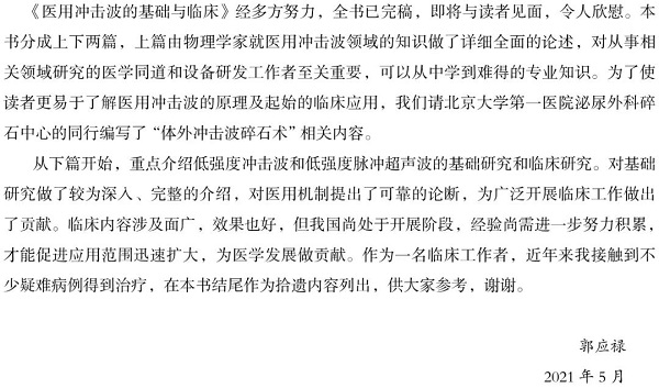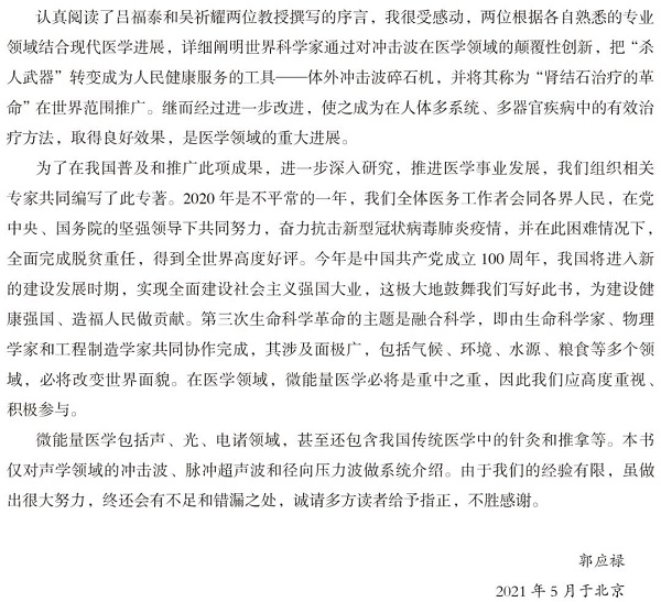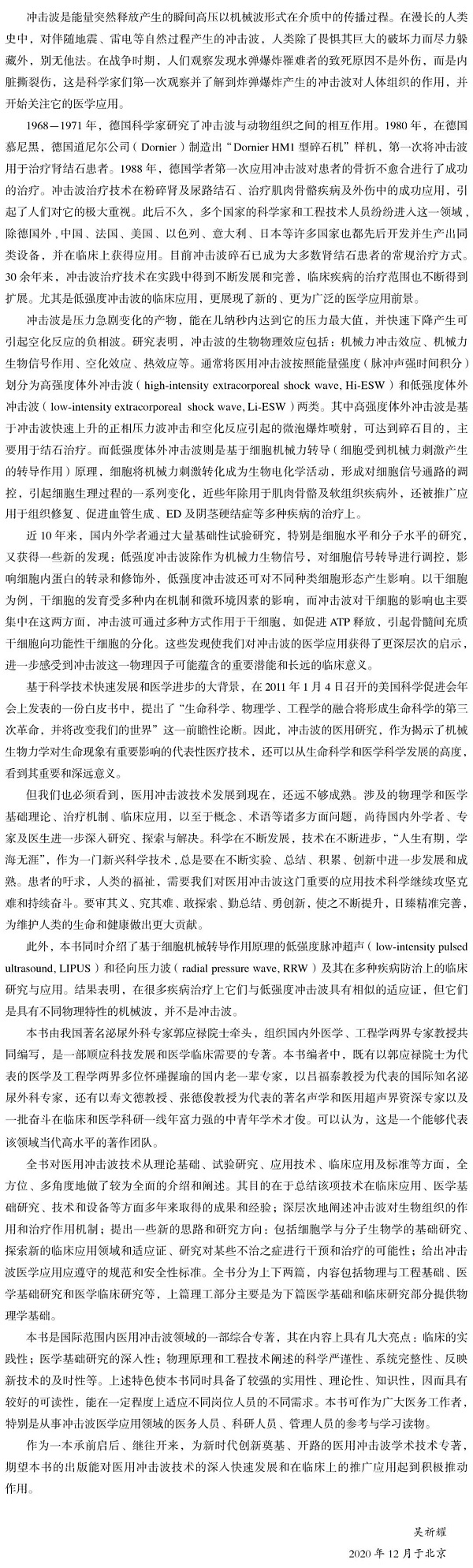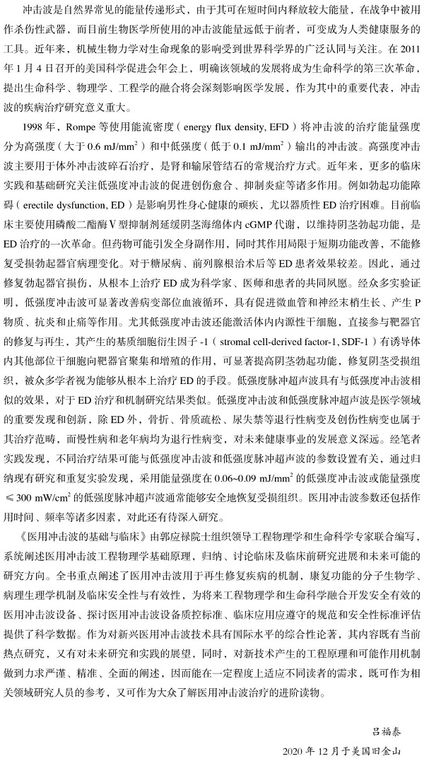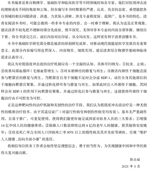 《医用冲击波的基础与临床》(订购)由工程物理学和生命科学专家联合编写,分为上下两篇,上篇由物理学家就医用冲击波领域的知识做了详细全面的论述,下篇重点介绍低强度冲击波和低强度脉冲超声波的基础研究和临床研究。本书的出版对推动现代微能量医学发展具有重要意义。作为一部医用冲击波技术的综合性论著,其内容既有当前热点研究,又有对未来研究和实践的展望,同时又有对新技术发生的工程原理技术和可能作用机制阐述,能在一定程度上适应不同读者的需求。既可作为相关领域研究人员的参考,也可作为大众了解医用冲击波医疗的进阶读物。