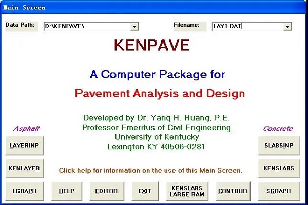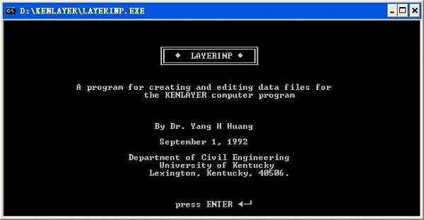 沥青路面结构力学分析软件KENLAYER,是由美国肯塔基大学的黄仰贤(Yang H. Huang)教授主持研发的。KENLAYER是一个主要用于柔性路面分析计算的软件,功能全面、强大,计算准确、高效,已在国内路面工程行业得到广泛应用。后来,KENLAYER软件从DOS版本升级到了Windows版本,并与水泥混凝土路面结构分析软件KENSLABS合并为KENPAVE。
