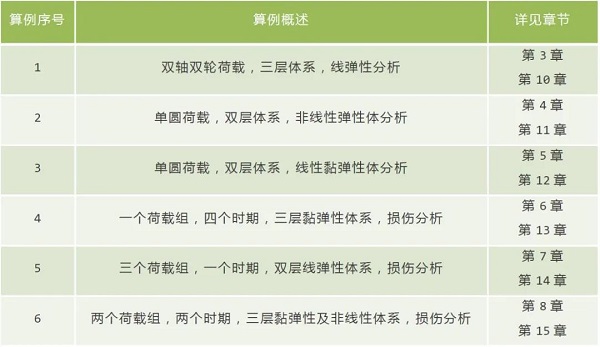 书中的6个算例,涵盖了沥青路面结构力学分析的多种情况。下面用一张表格说明一下《沥青路面结构力学分析软件KENLAYER》对算例的学习安排。