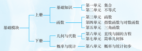教材严格依照《中等职业学校数学课程标准》编写,基础模块上册、下册内容结构如下。