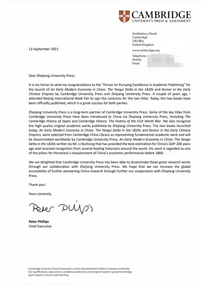 剑桥大学出版社及英语考评部全球CEO Peter Phillips先生发来祝贺致辞,他表示,“剑桥中国文库”中挑选的《中国的早期近代经济:1820年代的长江三角洲》《汉代的谣言》这两本书,是在中国史领域中开创先河的基础学术工作,相信其国际影响力将通过剑桥大学出版社的传播而日益久远。尤其是李伯重先生的《中国的早期近代经济:1820年代的长江三角洲》这本书,提供了对中国200年前GDP的一个最好的估测,受到了几位国际史学大师的肯定,认为其工作构成了彭慕兰重新评估1800年以前中国经济绩效的支柱之一。