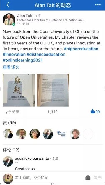 本书作者们也为参与由国家开放大学领衔的新书出版而感到高兴,纷纷将书籍出版的消息通过网络媒体渠道分享给读者朋友们。例如,英国开放大学前任副校长艾伦·泰特(Alan·Tait)教授通过领英(LinkedIn)发布了该信息,获得近百次点赞。