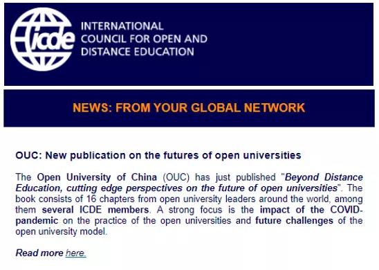 9月8日,国际开放远程教育理事会(ICDE)在其推送给会员的月刊中发布新闻称:“中国国家开放大学出版《超越远程教育》,该书由来自世界各地开放大学等机构的领导者共同撰文,其中很多机构为ICDE成员……”