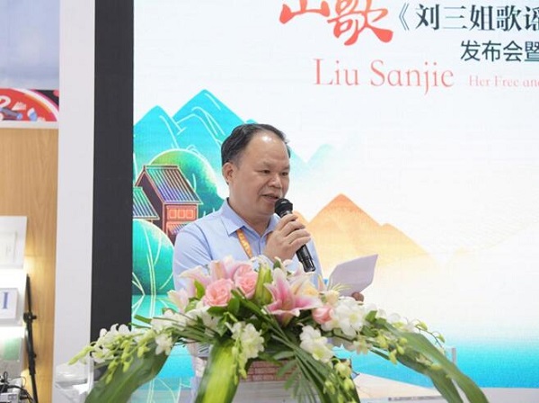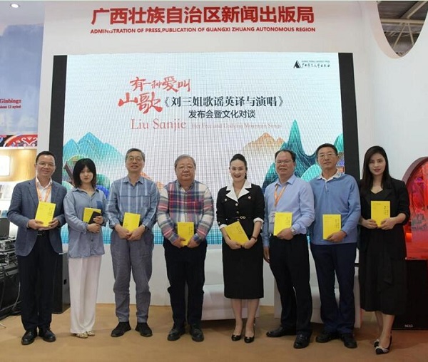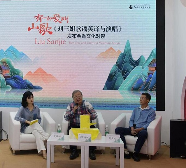 9月14日下午,由广西师范大学出版社主办的“有一种爱叫山歌《刘三姐歌谣英译与演唱》发布会暨文化对谈”活动在第28届北京国际图书博览会上举行。中国作家协会副主席、书记处书记吉狄马加,广西壮族自治区党委宣传部出版管理处处长黄品良,中国国家民族事务委员会国际交流司原副司长吴金光,中国社会科学院外国文学研究所研究员戴潍娜,广西艺术学校副校长、中国第五代刘三姐王予嘉,南宁学院教授、新书作者黄少政,广西师范大学出版社集团党委书记、董事长黄轩庄,广西师范大学出版社集团总编辑汤文辉等出席现场活动。广西音乐名家潘荣生,美籍音乐教师本杰明·劳伦斯·林德,澳大利亚著名诗人马克·特雷迪尼克通过视频为新书出版送上祝福。 被壮乡人民奉为歌仙的刘三姐,一直都是能歌擅唱、鄙视权贵、崇尚自由、反抗不义的化身。20世纪50年代末以来,基于对原生态民间传说的整理改编,历经戏剧、电影、小说、诗歌等不同形式的塑造,刘三姐早已声名远播,成为广西亮丽的文化名片和重要的非物质文化遗产。