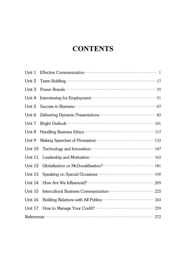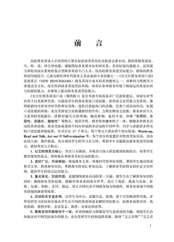 本教材广泛汲取建议,充分关注学习者的需求,与时俱进,选取目前最热门的话题,努力推出新内容,修订和完善部分章节内容和练习,力图实现语言技能、商务知识与人文素养的有机融合。该教材力图体现“实用性、全面性、话题式、趣味性”等特点,集科学性、教育性和趣味性于一体。根据各种商务活动的具体情境、商务交际的不同内容或商务活动的不同环节,为学习者提供多样的商务交际场景。全书共分17个单元,每个单元主要由4个部分组成:Warm-up, Read and Talk, Act It Out和Self-evaluation等。每个部分都设有针对性的交际活动,活动由浅入深,循序渐进,充分调动学生的学习自主性。