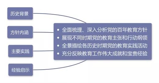 每章都按照历史背景、方针内涵、主要实践、经验启示的思路分析各历史时期党的教育方针。