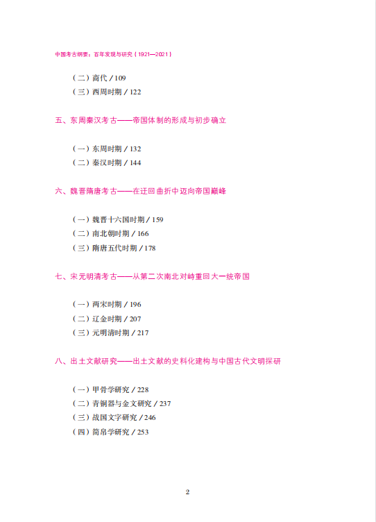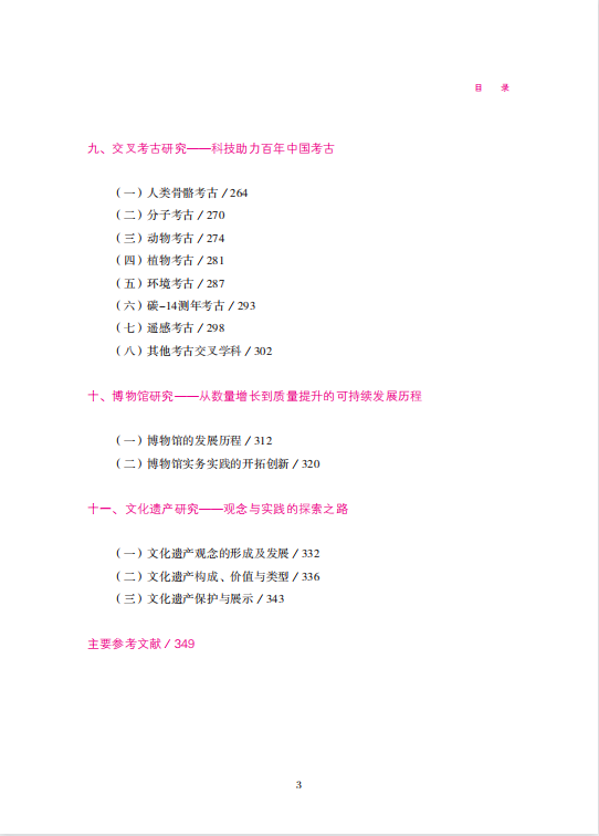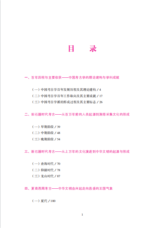 旧石器时期、新石器时期、夏商周时期重要的考古发现,体现从人类起源到中华文明走向昌盛王国的发展过程。战国秦汉、魏晋隋唐、宋元明清各时期重要的考古发现,阐述从帝国体制的形成到大一统帝国过程中的城址、墓葬、手工业等重要的考古遗址情况。第一章到第七章作为一个整体诠释了考古学泰斗苏秉琦先生的古国—方国—帝国的“三部曲”理论,体现了中华民族多元一体格局形成与发展的历史过程。第八章为出土文献研究,从甲骨学、金文、战国文字、简帛学等四个古文字学方向进行概述。第九章为交叉考古,即科技考古,包括体质人类学、分子考古、动物考古、植物考古、碳-14测年、遥感考古等多个方向内容。第十章为博物馆研究,阐述了从数量增长到质量提升的发展历程。第十一章从文化遗产观念、内涵与展示的角度阐释文化遗产研究。