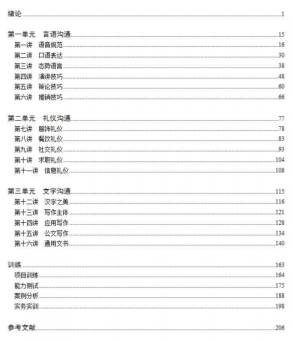 本书分为三部分:言语沟通、礼仪沟通、文字沟通。第一部分包括语音规范、口语表达、态势语言、演讲技巧、辩论技巧、推销技巧;第二部分包括服饰礼仪、餐饮礼仪、社交礼仪、求职礼仪、信息礼仪;第三部分包括汉字之美、写作主体、应用写作、公文写作、通用文书。本书精选项目训练题10套、沟通能力测试题10套、沟通案例分析10个、实务实训情境10个,沟通方式齐全、案例精彩丰富、训练科学有序,题例新颖,逻辑严谨,实用性强,趣味性高,有助于全面提升学习者的人文修养和沟通能力。