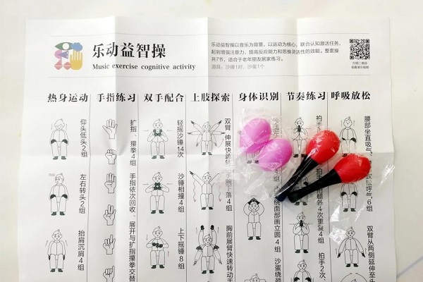 参考挂图上的动作图解以及扫码观看视频,搭配沙锤、沙蛋练习乐动益智操,帮助有效锻炼,愉悦身心。(配有沙锤、沙蛋各1对)