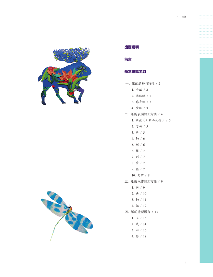 书中第一部分为基本技能学习,在讲解纸的基本品种和性能的基础上,以详尽的图示和文字讲解介绍了纸的表面加工法和立体加工方法,基本涵盖了纸工制作所需的技能。在基本技能学习的基础上,将创意技法归纳为点、线、面的运用,使接下来的技法实例介绍更具有系统性。