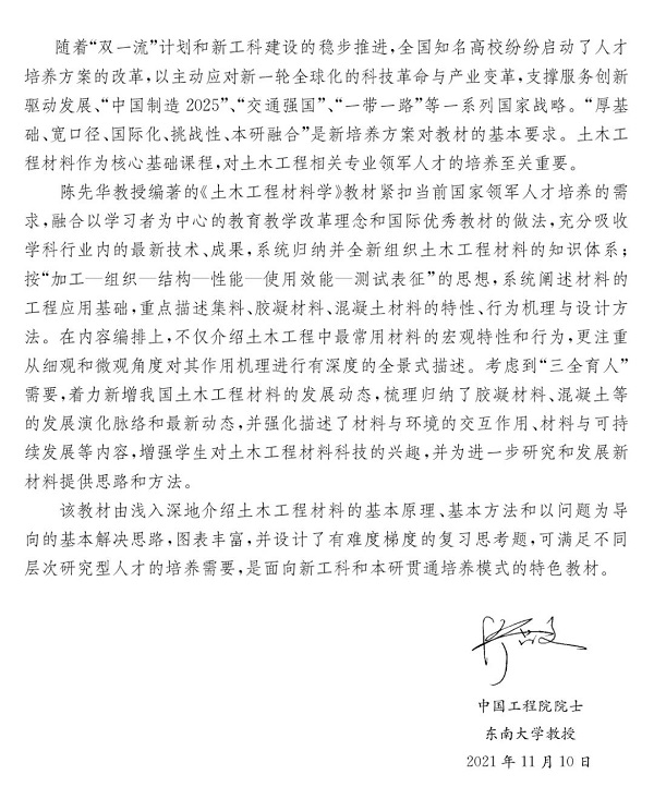 本教材为东南大学规划教材,根据一流专业人才培养目标和本研一体化教学改革要求编制,面向土木工程、道路桥梁与渡河工程、建筑材料等专业的本科生和研究生。全书有九章,内容包括:材料工程应用基础、传统集料和特殊集料、石灰、石膏、硅酸盐水泥、改性水泥、普通水泥混凝土、辅助胶凝材料、高技术混凝土、聚合物混凝土、沥青、沥青混合料。本教材不仅描述材料的宏观物理力学性能,更注重细观甚至微观层面的原理性描述,在加强土木工程材料学中的基础理论、基本概念和基本测试原理的同时,还描述土木工程材料的发展演变,以及材料的实际行为及其与环境的相互作用,并融入国内外标准规范方法的对比。