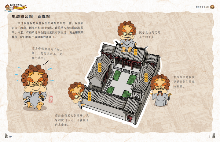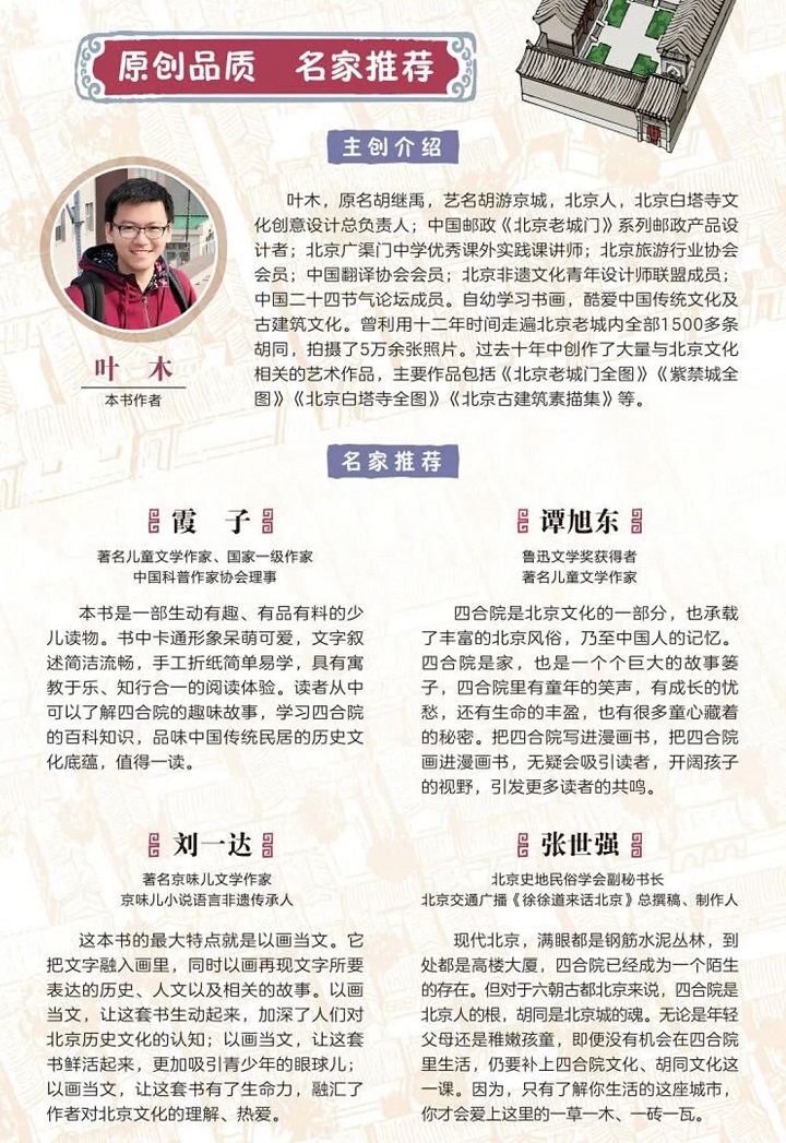 四合院是中国传统住宅建筑的典型代表,体现了我国优秀的传统文化和中国人的生活哲学。但是随着经济社会的快速发展,人们居住环境的不断改善,很多人对四合院这一传统民居已逐渐淡忘,或者现存的四合院由于各种改造,已失去了其本来的面目。本书作者利用十二年时间,走遍北京老城内全部1500多条胡同,拍摄了5万余张照片,希望通过图片、插画的形式,希望向青少年呈现四合院的本来面目,生动介绍四合院的文化知识。全书共分为五册:“四合悠悠历九朝”“威风堂堂话宫宅 ”“院门座座不尽同 ”“宅院深深有洞天”“日子欣欣欢乐多 ”,分别介绍了四合院的发展历史、形制规格、内外装饰、百姓生活等,通过阅读本书,读者可以很好地了解四合院的相关知识。