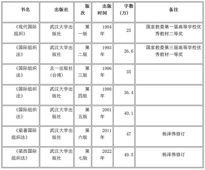 《现代国际组织》在此后长达30多年的历史进程中,得梁西先生多次精心修订。1993年作为“七五”“高等学校文科教材”出第二版,更名为《国际组织法》,荣获国家教委第三届高等学校优秀教材一等奖。1996年应约再作修改后,又以繁体字竖行本在台湾(志一出版社)出第三版。1998年出第四版。2001年出第五版,经教育部研究生工作办公室推荐为“研究生教学用书”,被学界誉为不可多得的学术精品。2011年,杨泽伟教授协助梁先生修订出版了第六版,更名为《梁著国际组织法》。2022年,杨泽伟教授遵从梁先生遗愿,修订出版了第七版,定名为《梁西国际组织法》。