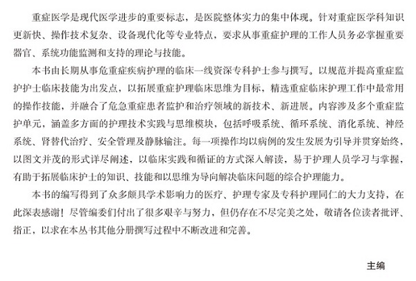 精选重症临床护理工作中最常用的操作技能,并融合危急重症患者监护和治疗领域的新技术、新进展。