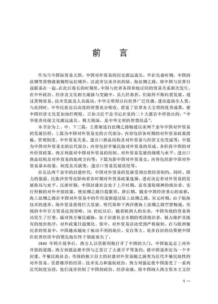 本书分为上、中、下三篇,主要阐述自丝绸之路畅通以来两千余年中国对外贸易的发展历程。上篇为中国对外贸易史的古代部分,内容包括各时期的对外贸易政策措施、管理制度、中外贸易关系、进出口商品结构及对外贸易与经济文化交流等;中篇为中国对外贸易史的近代部分,内容包括半殖民地对外贸易的形成、各阶段中国的对外经贸政策、西方列强对中国对外贸易的控制、对外贸易发展的规模与水平、进出口商品结构及对外贸易的地理方向等;下篇为新中国对外贸易史,内容包括新中国对外贸易基本政策、制度及其演变,进出口贸易发展状况等。