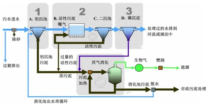 图3 一般市政污水处理厂的三级处理工艺流程图