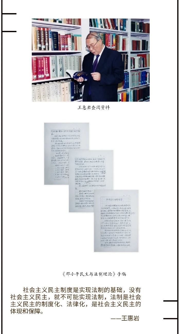 王惠岩先生是当代中国著名法学家。他积极探索马克思主义法学基础理论,参与创办吉林大学政治学专业,基于对政治学与法学的天然联系和深刻认识,坚持为政治学专业的硕士生、博士生讲授“法学基础理论”“法理学”,并从政治学的视角探索法学理论的创新,先后发表了《论民主与法制》《试论邓小平民主与法制理论》等论文,出版了《法学基础理论》,受到了法学界的高度评价,其中《论民主与法制》获得中宣部“五个一工程奖”。