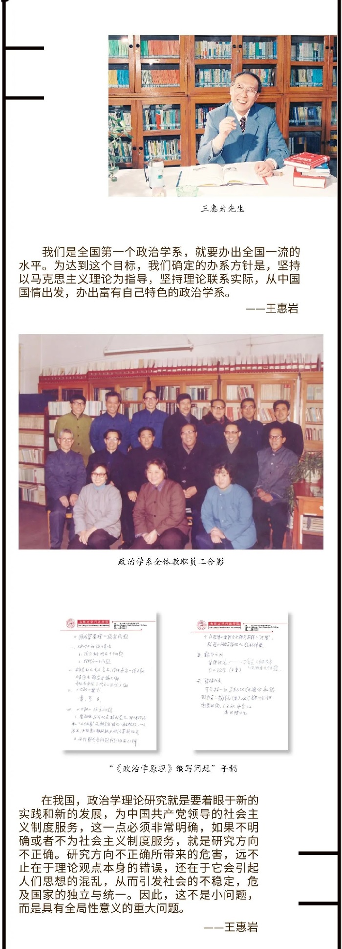 1983年王惠岩先生在吉林大学创立全国高校中第一个政治学系之时,一切几乎都是从零开始的:没有师资,他就三顾茅庐、广求贤能;没有图书、教学场所和设备,他就多方求助、争取支持。经过艰苦的努力,王惠岩先生带领全系教师积极探索出一条办学路子,确定了政治学系的办学目标,制定了政治学专业的教学计划,规范了政治学课程设置,为全国其他高等学校设置政治学专业起到了示范作用。如今吉林大学政治系已经发展为行政学院。目前,学院设有政治学和公共管理两个博士后科研流动站、政治学和公共管理两个一级学科博士学位授权点,下设政治学理论、法律政治学、廉政学、国际政治、国际关系、行政管理、应急管理、公共治理与公共政策八个博士点,政治学理论、中外政治制度、法律政治学、廉政学、国际政治、国际关系、行政管理、应急管理、公共治理与公共政策、电子政务十个硕士点和公共管理硕士(MPA)专业学位授权点,政治学与行政学、国际政治、行政管理三个国家级一流本科专业。政治学理论为国家重点学科,政治学和公共管理两个一级学科均为“985”工程二期和“211”工程三期重点建设学科,政治学为“双一流”学科群支撑学科、吉林省世界一流学科建设学科,公共管理为吉林省优势特色学科A类。