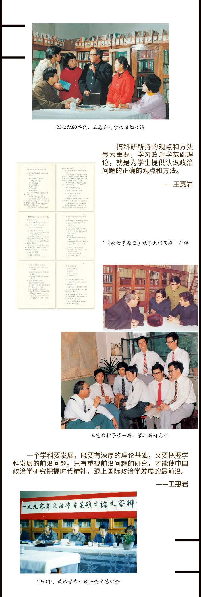 王惠岩先生是当代中国杰出的教育家。他一生致力于教育事业,对教育的本质有深刻的理解。王惠岩先生备课一丝不苟,每次上课前都修改讲义,每一稿字迹都工工整整,没有任何涂抹之处。讲义内容不仅有理论原理,还包括不同时期党的大政方针分析,国内外新形势、新问题的研究等,始终与时俱进。王惠岩先生重视基础教学环节,先生曾说:“讲授专业基础课最重要的是讲清楚‘三基’,即基本概念、基本观点、基本知识。”“讲好课的功夫在课外,就是要认真备课,要把讲的内容融会贯通,并要做好教学笔记。”