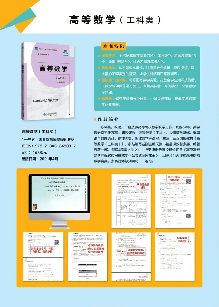 本教材的特色归纳起来主要体现在:以实用为原则,充分体现“提高数学素养,为专业服务,为职业生涯发展奠定基础”的数学课程的定位,和数学教学与专业培养结合,应用技能与文化素养并重的理念,内容体系整体优化,突出“用数学”能力的培养,使读者实现由知识向能力的转化,并在结构上遵循高职学生的认知规律,数字化教学资源素材丰富,且好看、好教、好学、好用,达到便于“教与学”的效果。