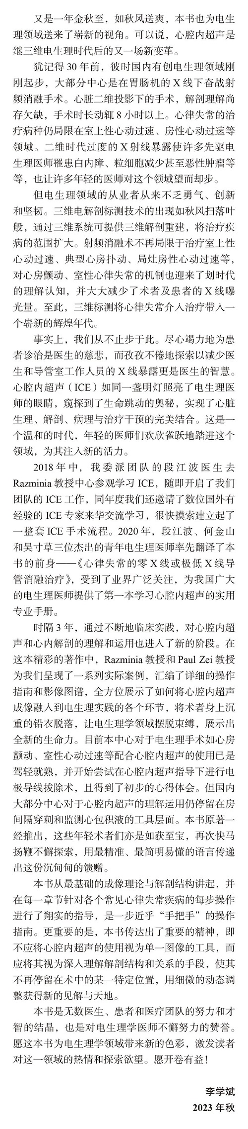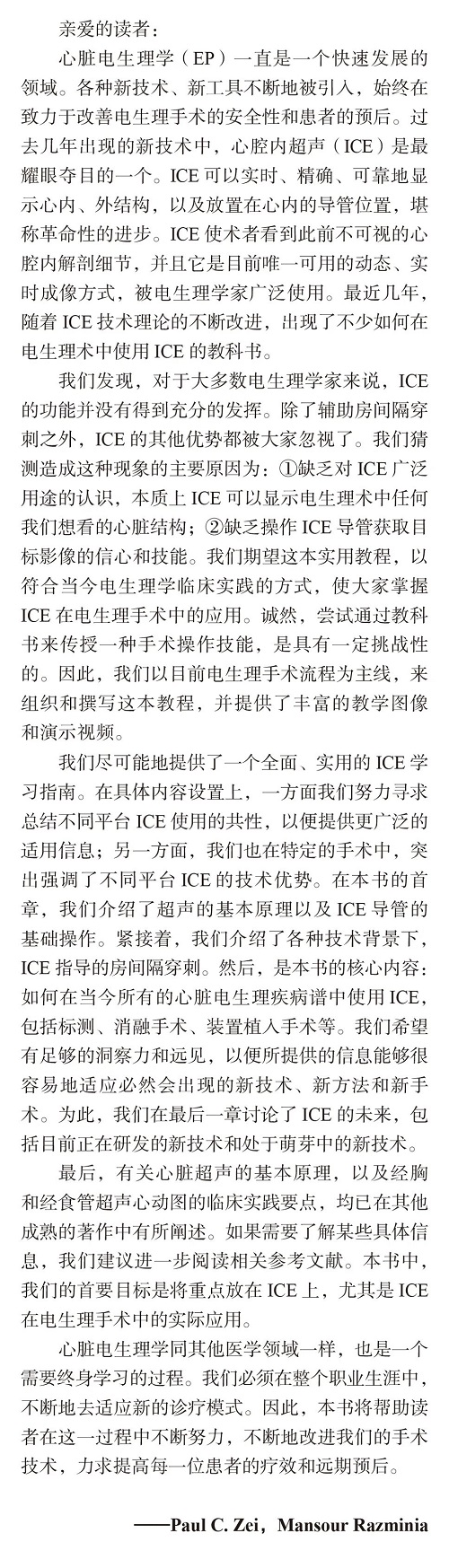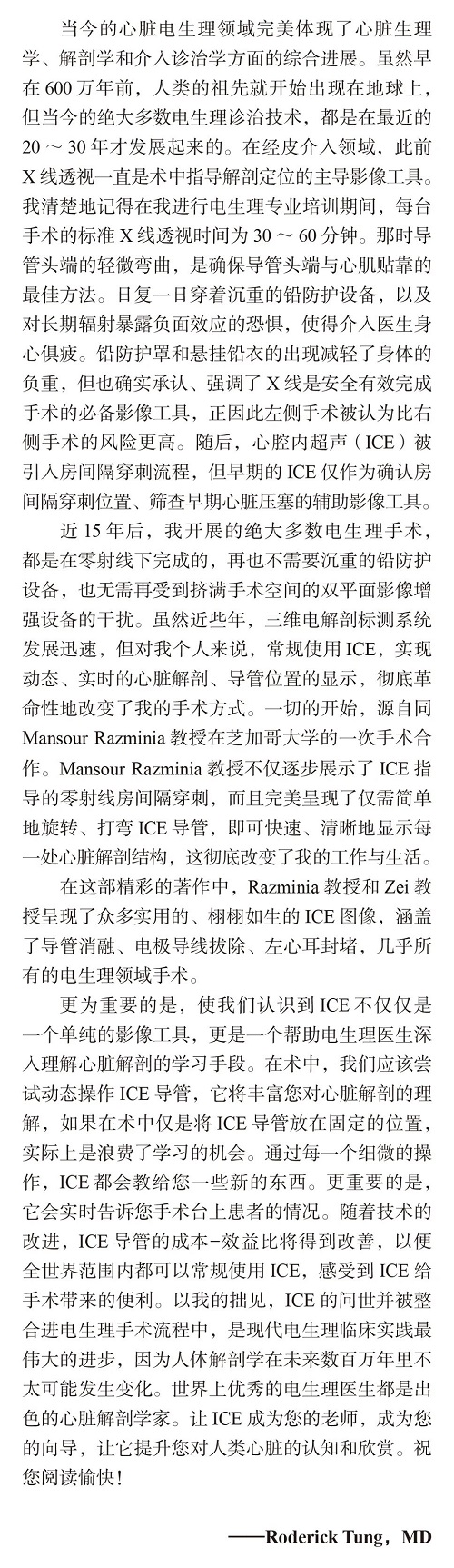 撰写本书的专家,均具有丰富的心腔内超声应用经验,他们将自身深厚的专业知识倾囊相授。另外,本书的编者们还曾合作编写过Cardiotext Publishing出版的相关教程《心律失常的零X线或极低X线导管消融治疗》。