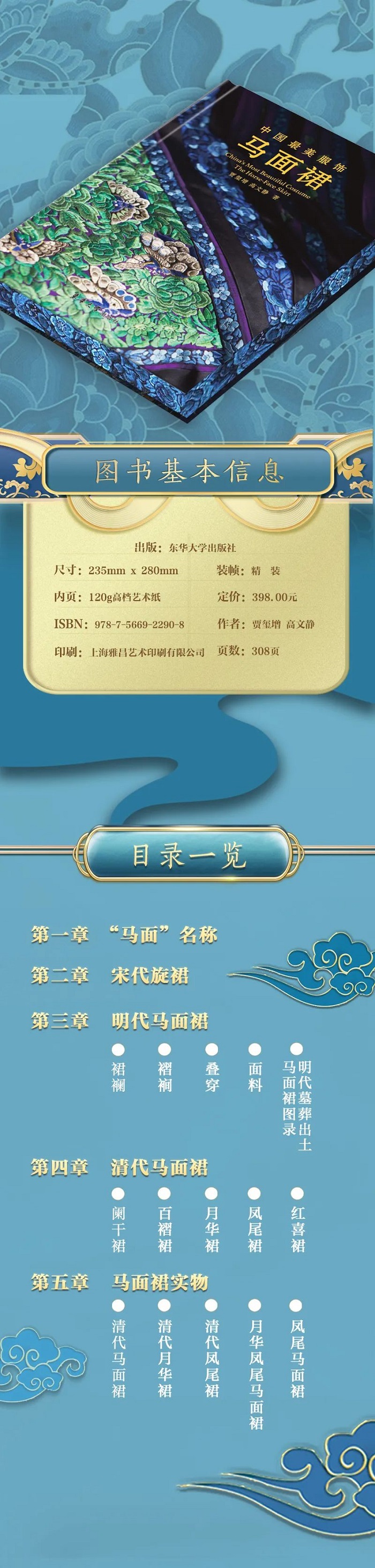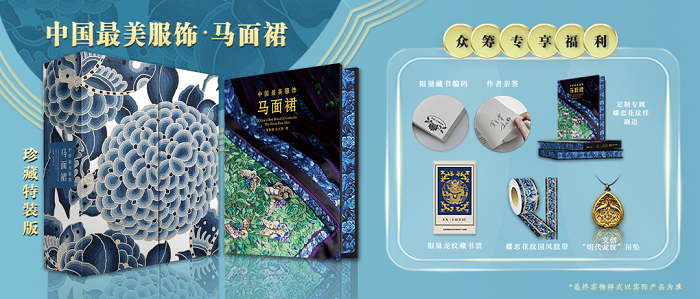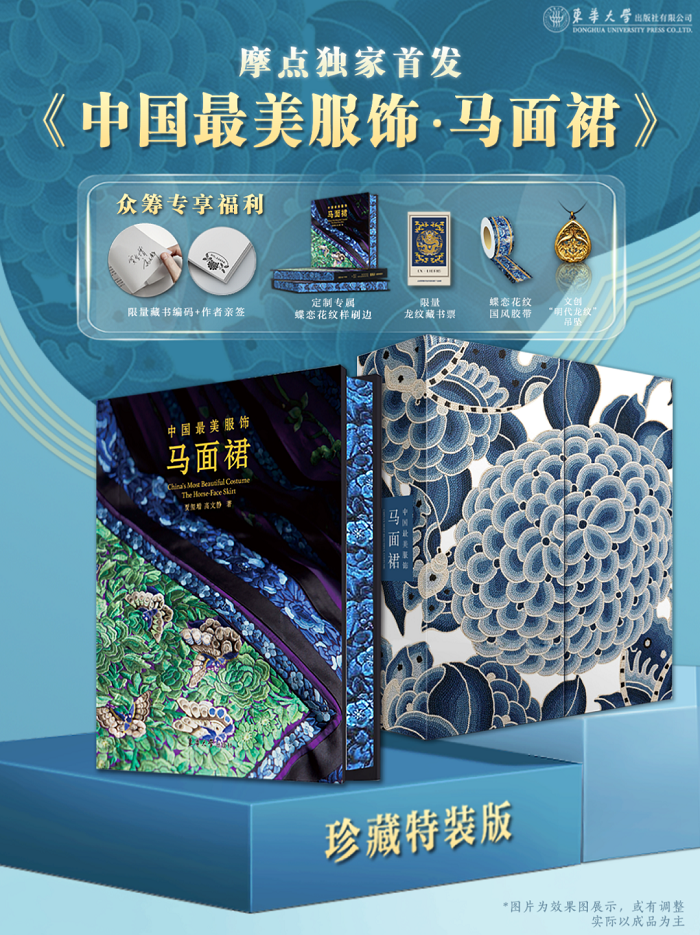 千呼万唤始出来!《中国最美服饰·马面裙》在摩点平台开启众筹。感兴趣的读者朋友们别错过啦!东华大学出版社为本书在该平台众筹预售,定制了一系列专属权益——1. “三蓝绣”国风书盒;2. 蝶恋花纹样刷边;3. 每本书都有唯一的藏书编码;4. 两位作者(清华大学贾玺增教授和清华大学艺术博物馆高文静老师)联名亲签等。(在本书众筹期间,在摩点参与众筹的读者,皆享有以上全部权益)。众筹结束本版即绝版,之后仅有通贩版发行。